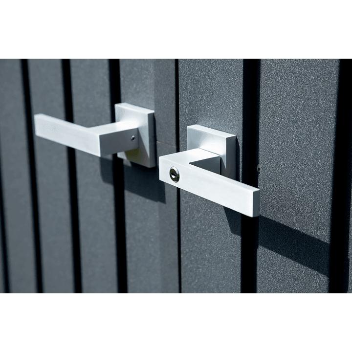 - The contemporary, new squared wall panel design of this steel shed gives a modern clean appearance.