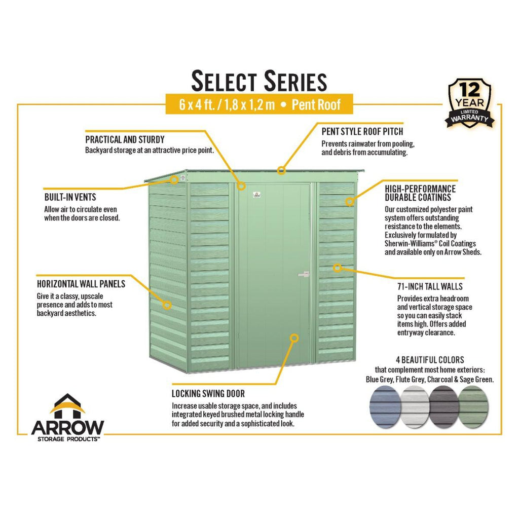 Arrow Select Steel Storage Shed 6 x 4 ft. | Pent Roof