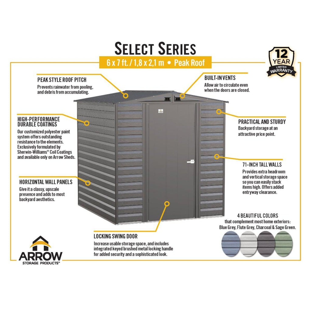 Arrow 6 x 7 ft. Select sheds, made of galvanized steel treated to resist corrosion/rust and offer storage protection from the elements. With 71" walls, lots of headroom, vertical storage, and clearance at the entryway, it's ideal for tall items. A high gable roof prevents rainwater and debris, plus built-in air vents and locking door handles. Painted with Sherwin-Williams® finish, it's shielded from rust and corrosion.