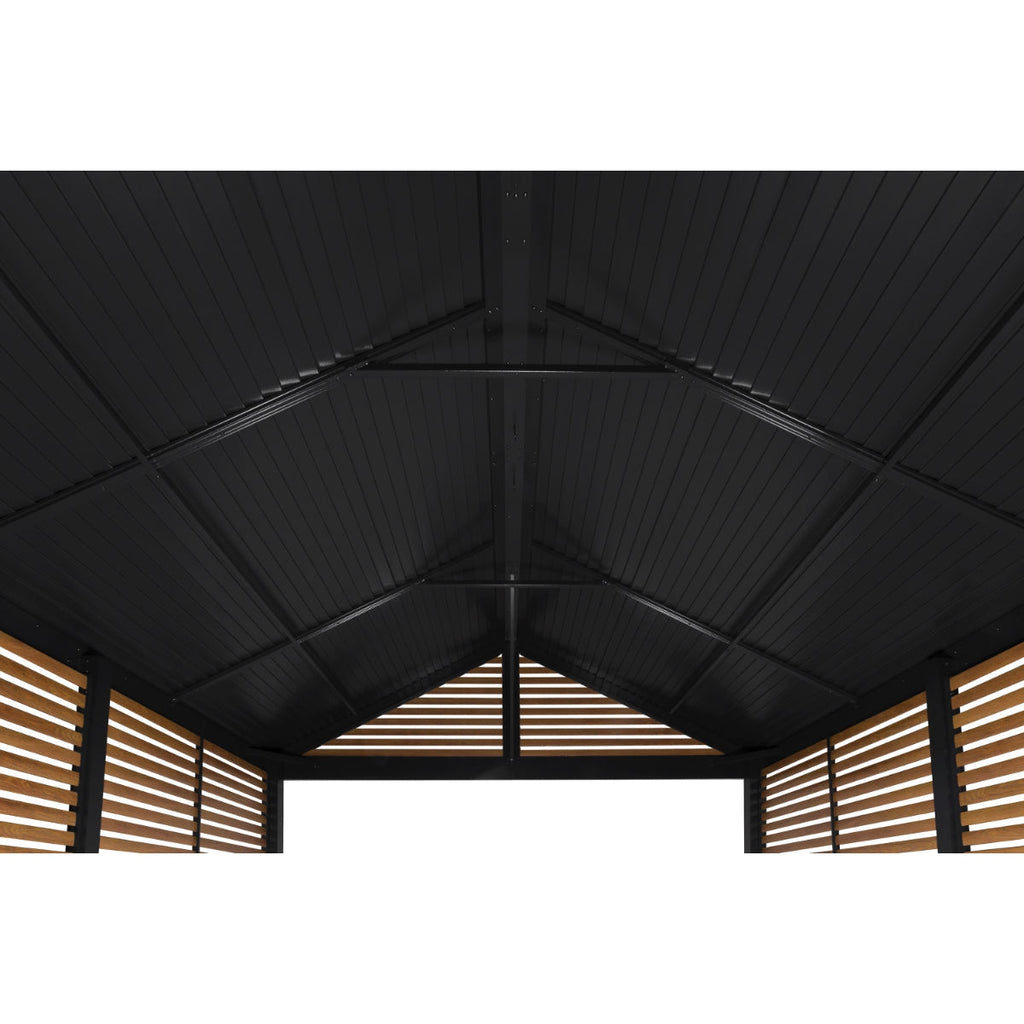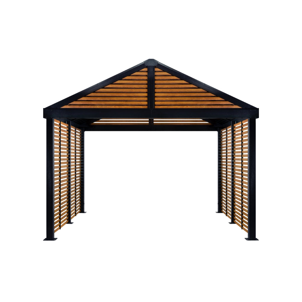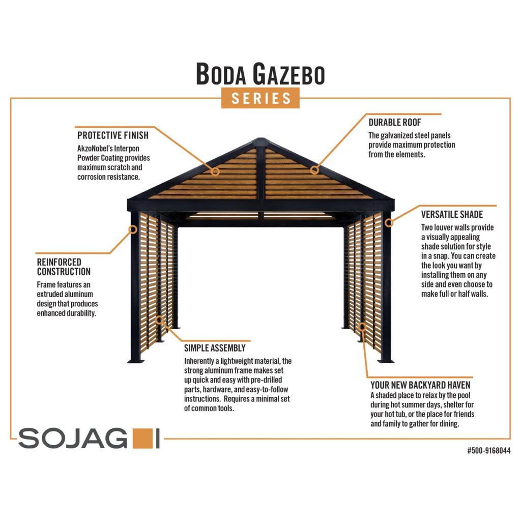 Rediscover your outdoor space with the 12 x 12 ft. Boda gazebo! Create a look tailored to your taste by choosing to install one or both of its louver walls full or half-length. This gazebo provides stylish protection from the sun and adds privacy with its modern, dark tones. Built to last with its rustproof aluminum construction and galvanized steel roof, this gazebo will be a timeless addition to your backyard.