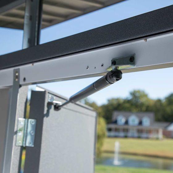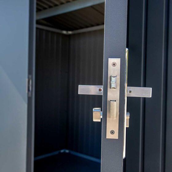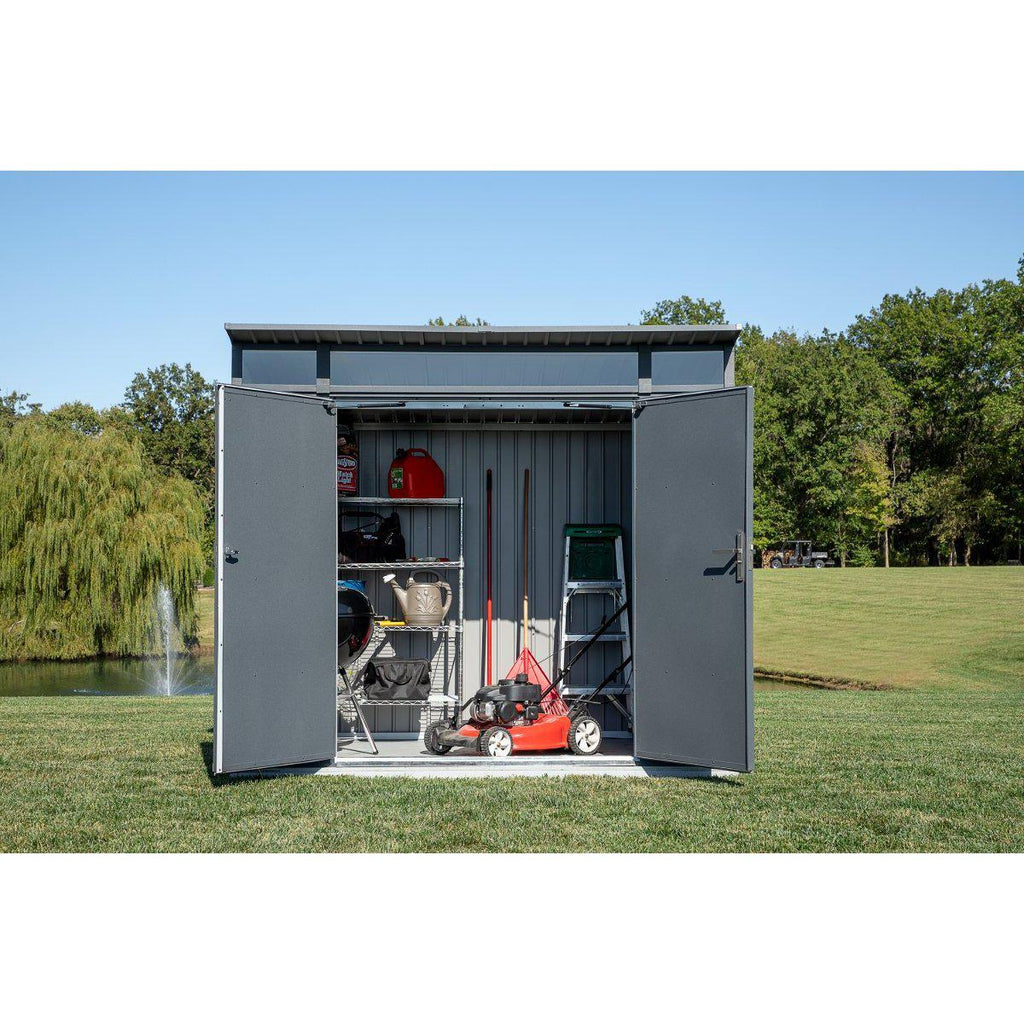 The stylish, strong Denali 8 x 5 ft. Steel Shed is the ideal outdoor storage solution. Crafted from Galvalume, this aluminum, zinc, and silicon-plated steel offers impressive rust protection and is 70% thicker than other sheds. Its sleek squared wall panel design and windows for natural lighting give Denali a modern, clean look. The double swing doors include pneumatic assists, a stylish brushed metal handle, and a key-locking deadbolt for secure protection.