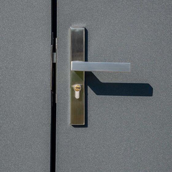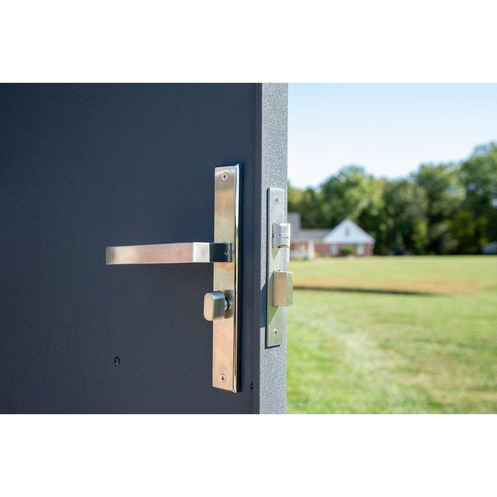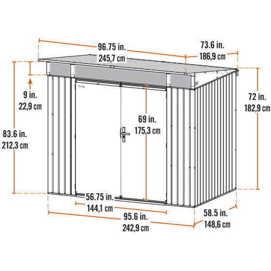 - CONTEMPORARY DESIGN: The new squared wall panel design of this steel shed gives a modern, clean appearance. The sturdy reinforced, wide swing doors included a squared-off brush nickel handle with a key lock protecting your items when not needed