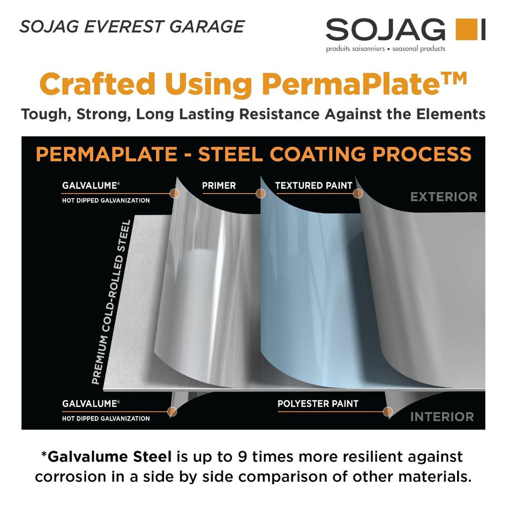 The Everest Garage Series is a stylish, premium garage from SOJAG. The 12 x 15 ft. Everest is made strong and is made with tough Galvalume steel that's aluminum, zinc, and silicone plated for exceptional corrosion resistance. The unit features a wind and snow load rating and a stylish premium paint-textured finish.