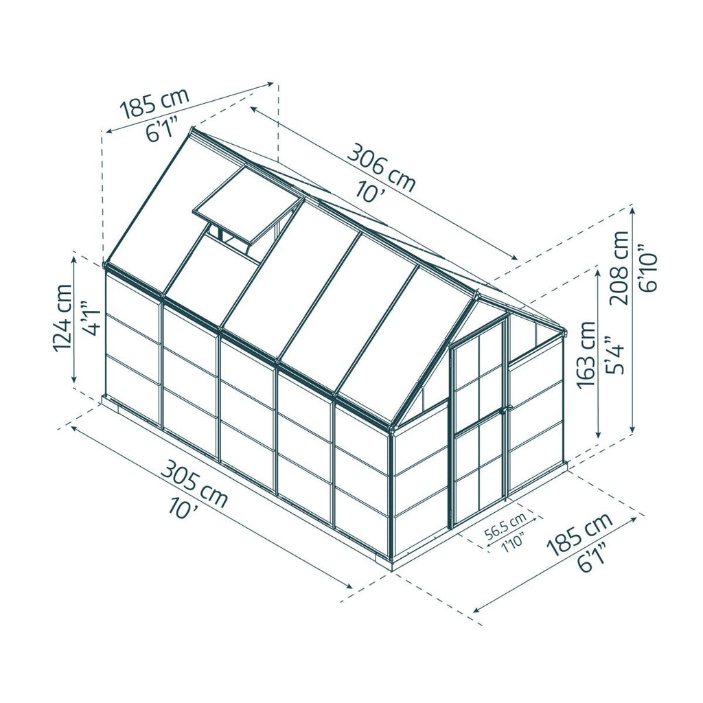 Canopia by Palram's Hybrid 6x10 ft. Greenhouse offers a perfect growing environment with polycarbonate panels to balance your plants' needs. 4mm twin-wall roof panels have double heat retention while 90% light transmission side panels block UV rays. Durable aluminum frame and integrated gutter system. Plus a roof vent and hinged door for adjustable ventilation. Easy to assemble with no special tools. Enjoy a longer growing season and protect your plants with the Hybrid Greenhouse!