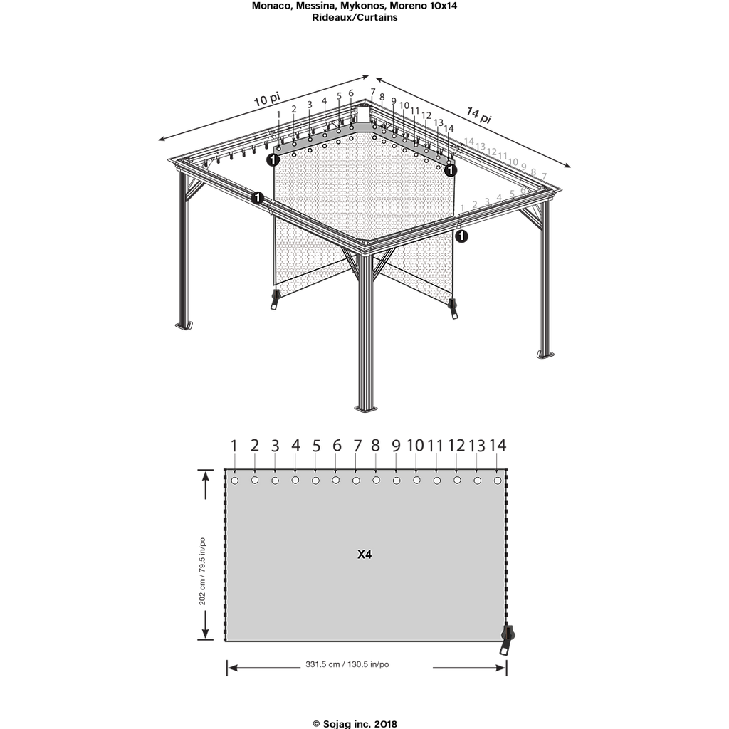 Disclaimer: Designed for Sojag Monaco, Messina, Mykonos, and Moreno 10 x 14 ft. gazebos, may not 100% fit other brand gazebos. Please refer to the drawing of dimensions or contact us to make sure this will fit your gazebo before purchase. Returns due to "not fitting other brands" will NOT be accepted.
