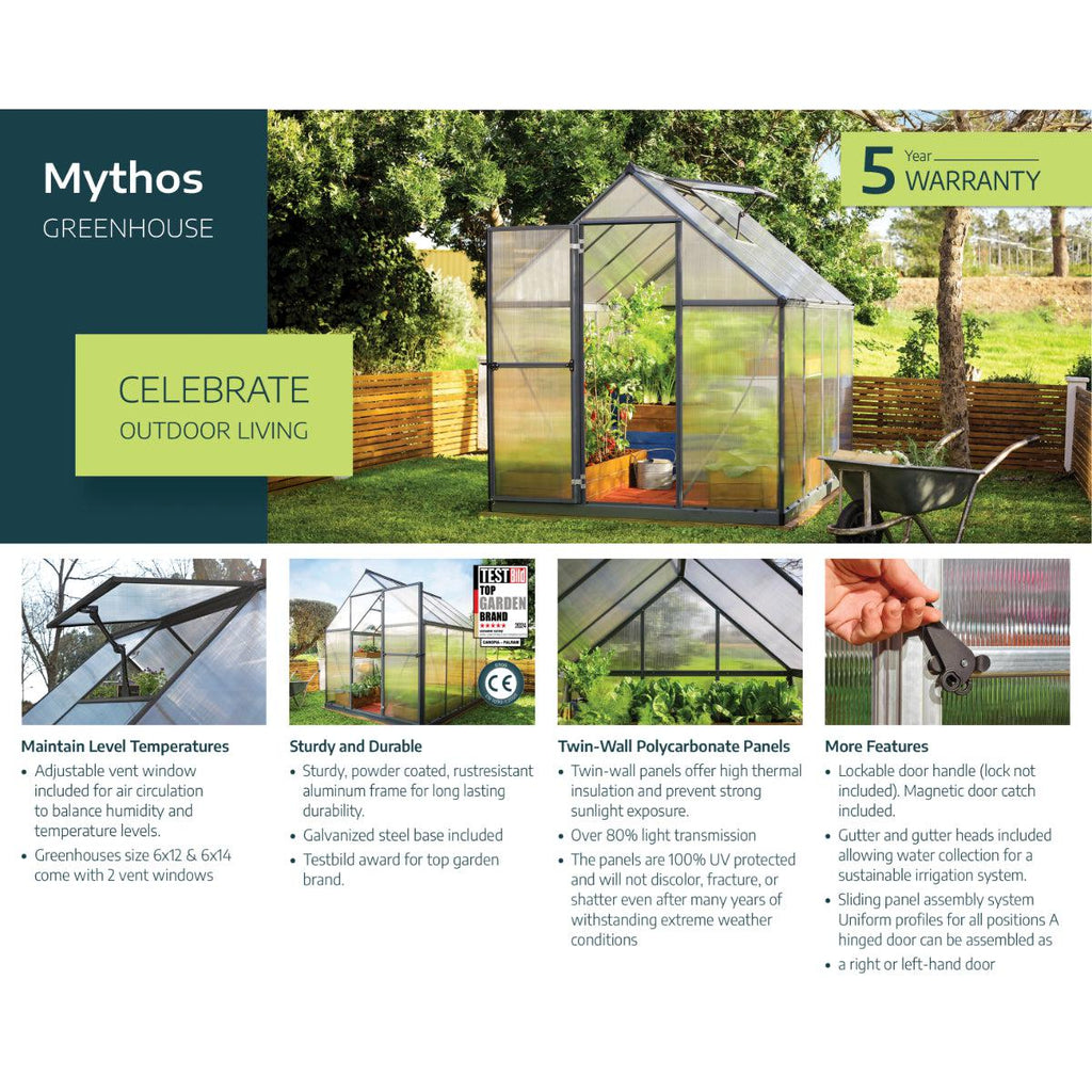 The Mythos Greenhouse helps you to maintain level temperatures and diffuse sunlight for sensitive plants. It is a sleekly designed greenhouse, featuring virtually unbreakable, twin-wall polycarbonate panels, and a heavy-duty, rust-resistant aluminum frame. The Mythos greenhouse is elegant and practical, perfectly designed to fit smaller spaces and protect your plants from the elements so you can start growing earlier and continue growing later.