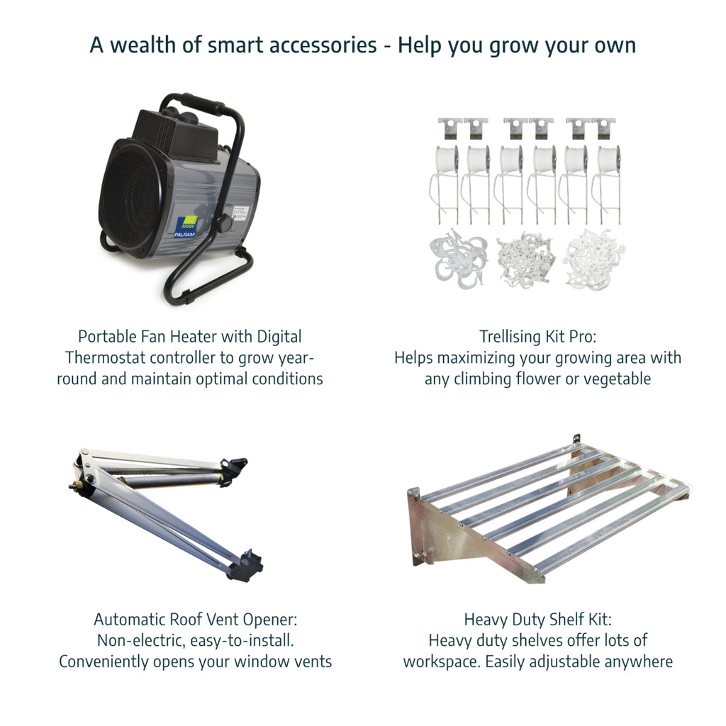 Fan heaters, lighting kits, shade cloth kits, automatic roof vent openers, staging and shelving, plant hangers, trellising kit, and drip irrigation kit are all available for purchase separately.