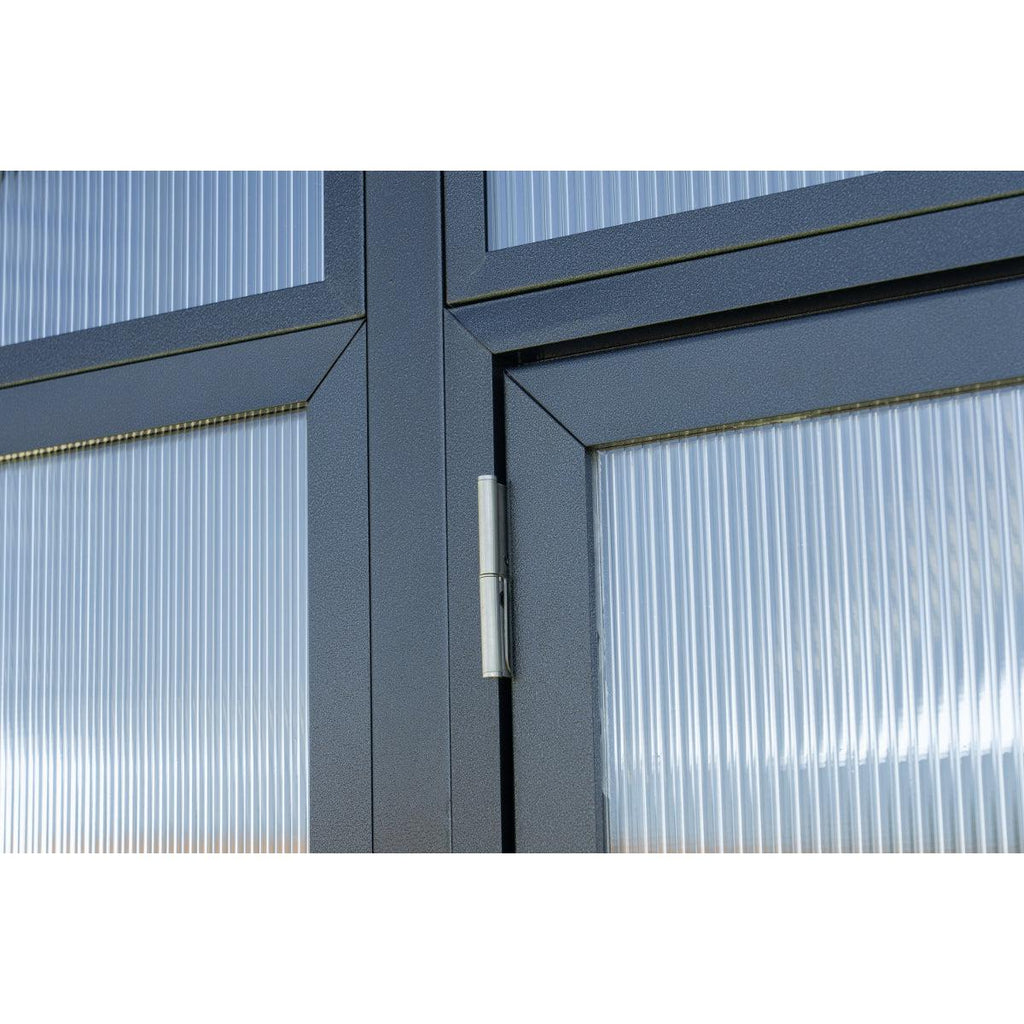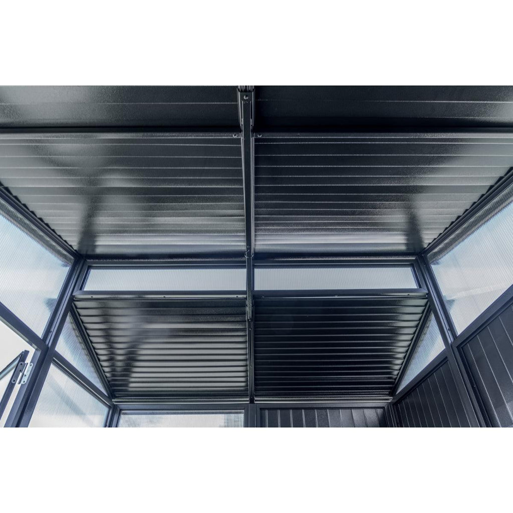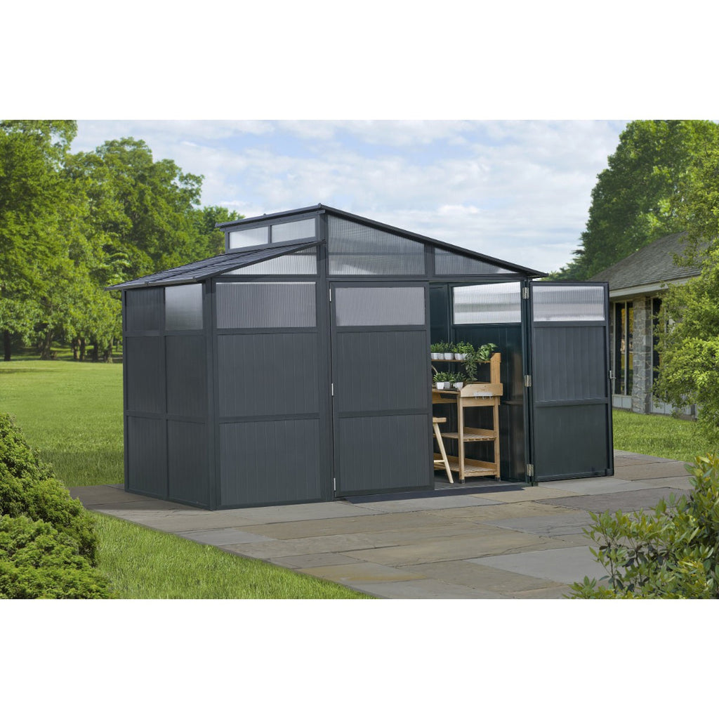 Sojag's Rainier 8x11 ft Aluminum Storage Shed is a rustproof and stylish solution for your backyard storage needs. With polycarbonate panels, natural light floods in, making it easy to locate equipment and materials. The sturdy aluminum frame and galvanized steel roof provide durability for long-term use. Simplify storing large equipment with the spacious 449 cu ft. of space and 6 ft 8 inch double doors. Transform your backyard with Sojag's Rainier Storage Shed.