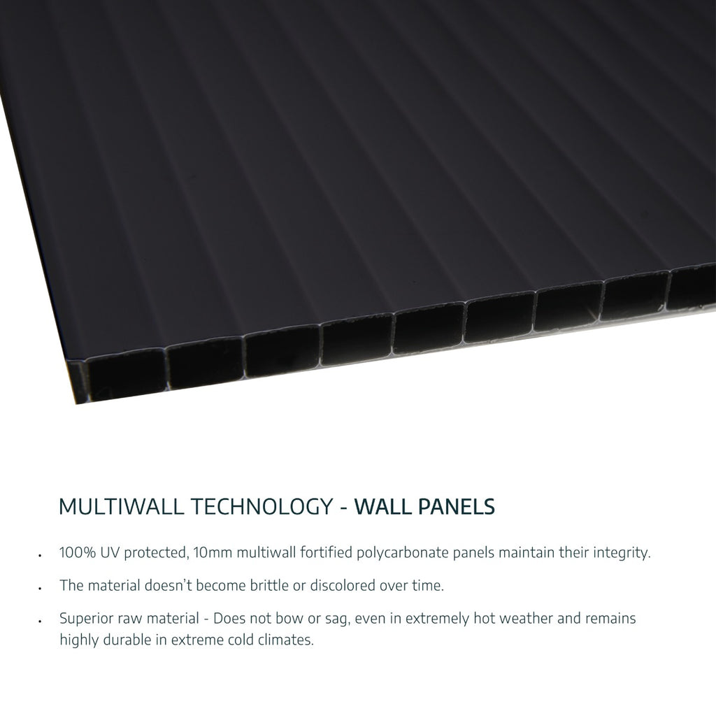 - 100% UV protected, 10mm multiwall fortified polycarbonate panels maintain their integrity