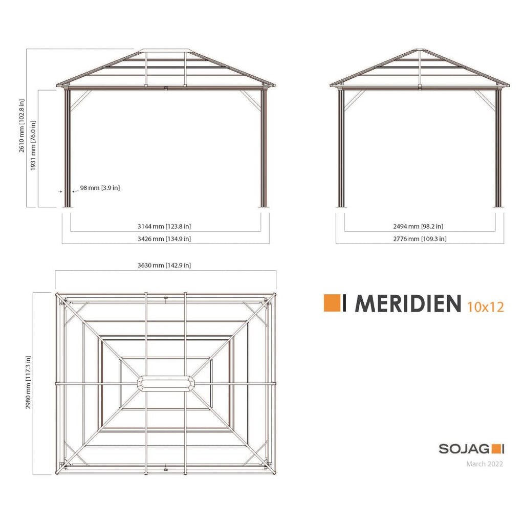The Sojag Meridien Gazebo 10 x 12 ft. sun shelter is a nice mix of classic and modern design. It can match any home without any problem. It supports a poly-carbonate roof allowing sunlight to penetrate inside without letting ultraviolet rays to reach you. The Meridien gazebo will shelter your most beautiful evenings with friends. You can adapt it to the size of your table!