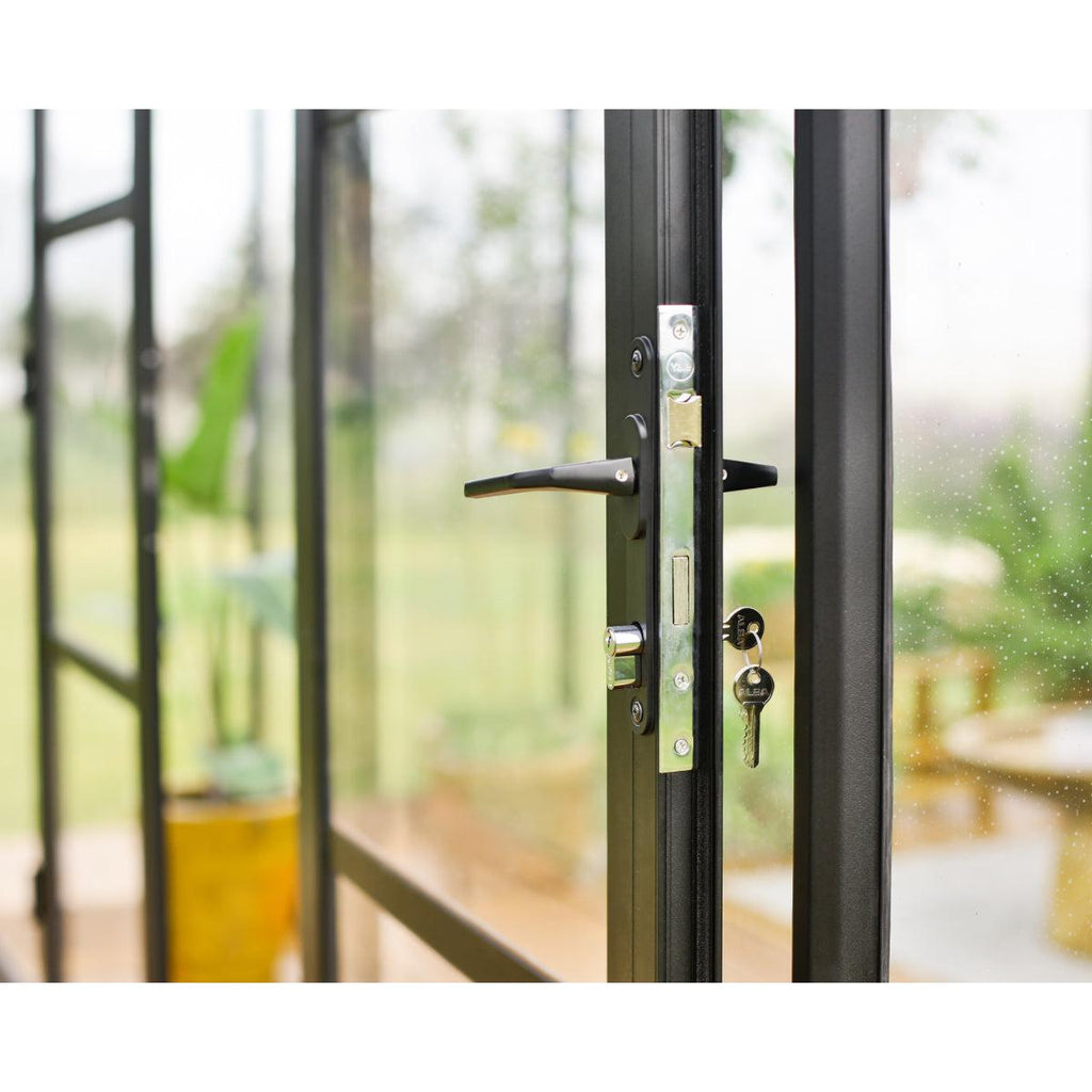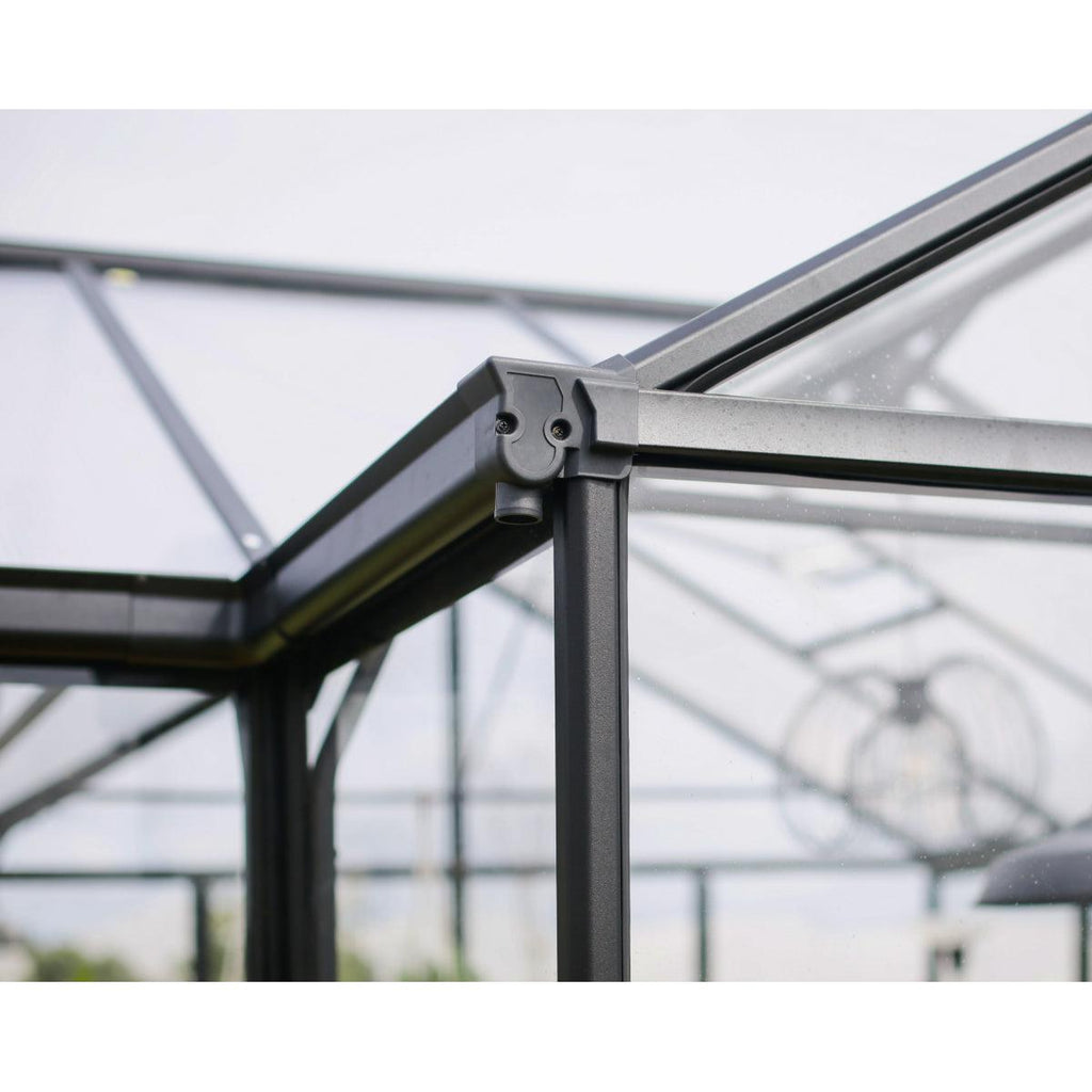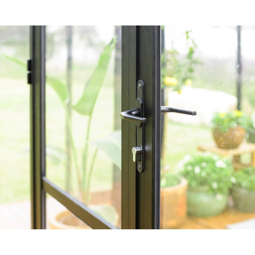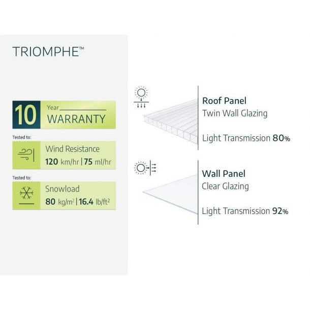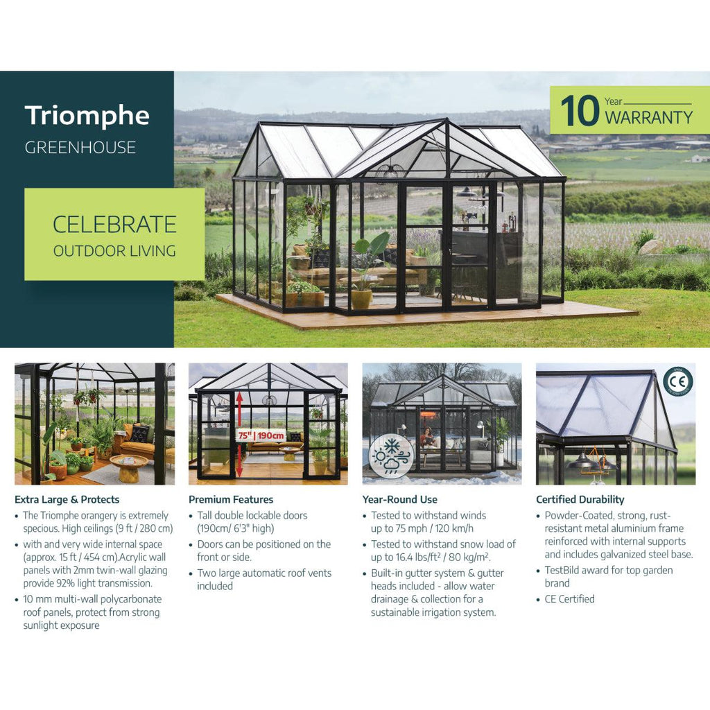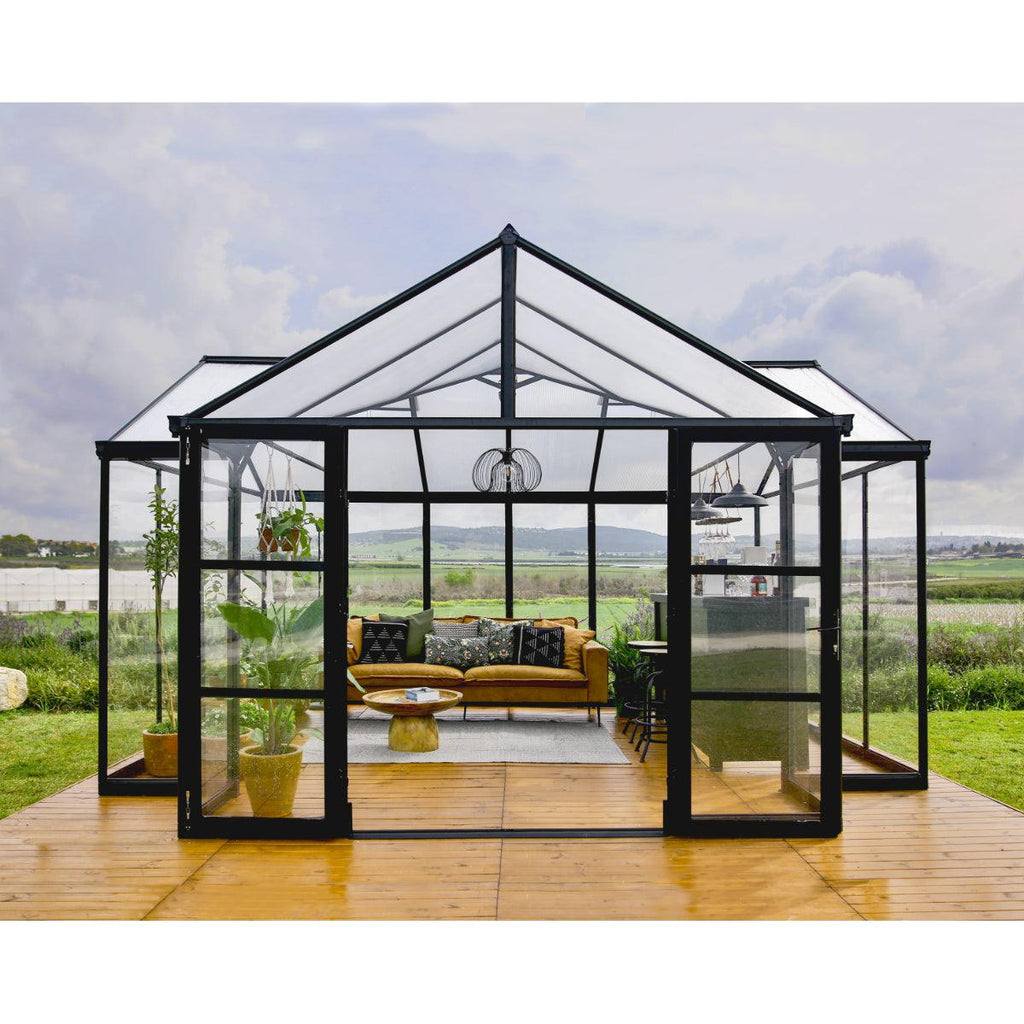 The Triomphe Garden Chalet offers a refuge in your yard with high side walls and a vaulted ceiling for over 9 feet of headroom. The T-shaped Orangery has room for a dining table and lounging area, plus lighting and heating are available for all-year use. Enjoy the ambiance with four large, automated roof vents and double swinging doors for ample airflow. The solid acrylic glass glazing provides privacy and sound reduction, and the aluminum frame with a black finish is durable enough to add shelves. The Triomphe is low-maintenance, so you can relax and celebrate every day.
